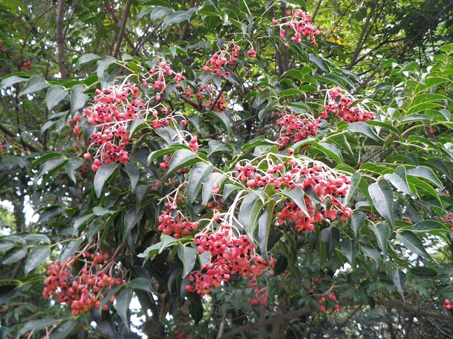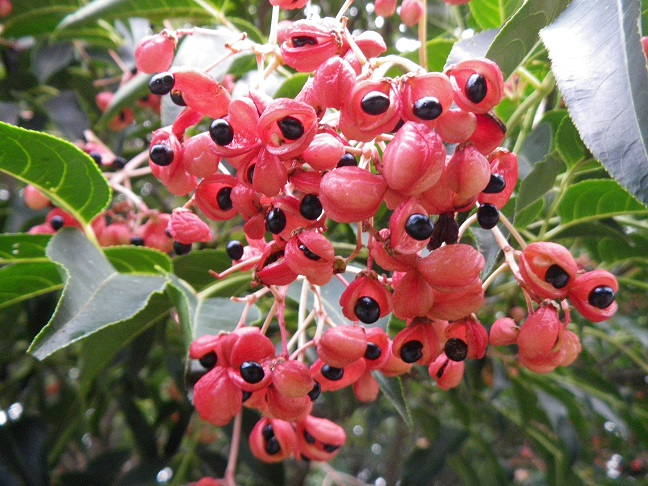 ゴンズイの果実は赤色の果皮が割れ、黒色の種子が見えだしていました。