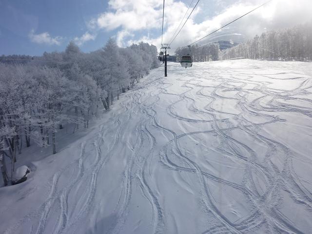 ゴンドラに乗り見下ろすと、非圧雪箇所が多いので驚きました。(右写)