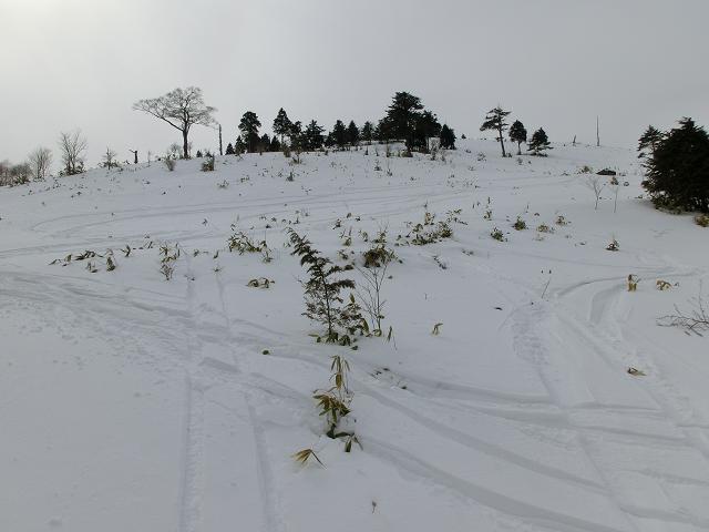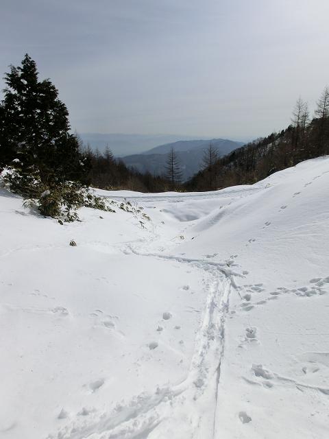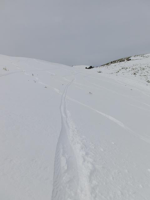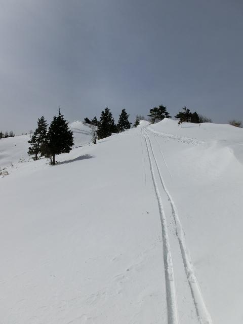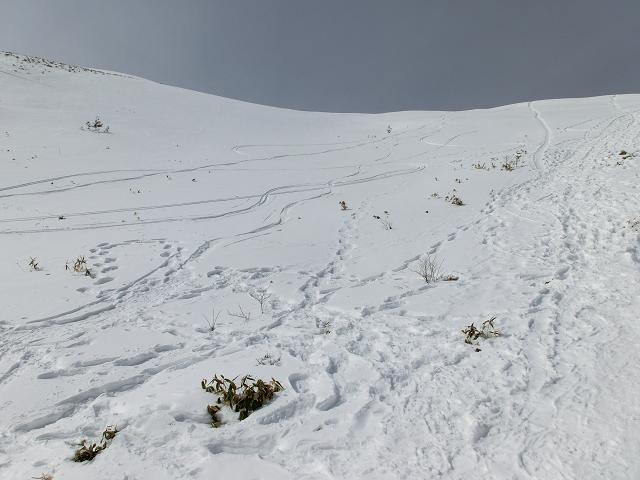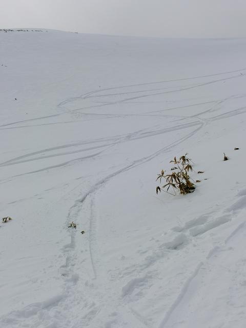 降雪量の少ない地域の笹原なので、根雪が無ければ踏み抜いてしまいますが、数日前のシュプールが沢山残っていたので、山頂から安心して滑り降りてくる事が出来ました。