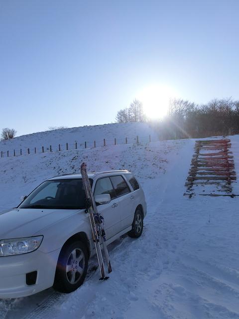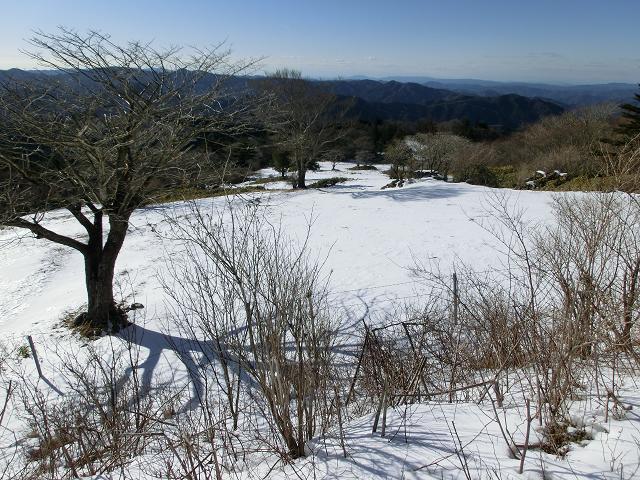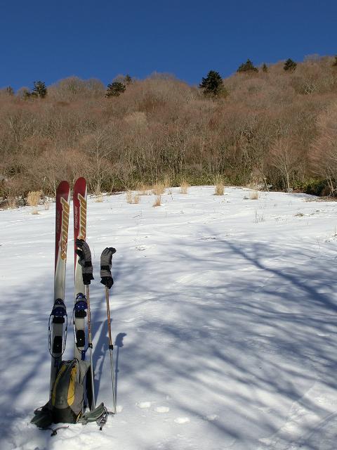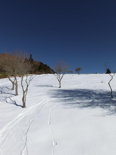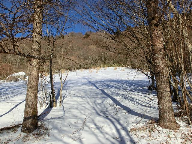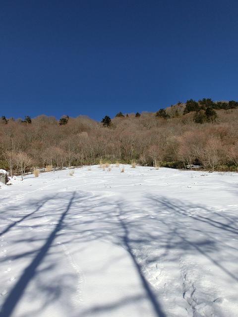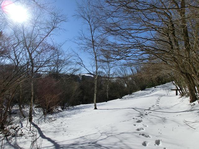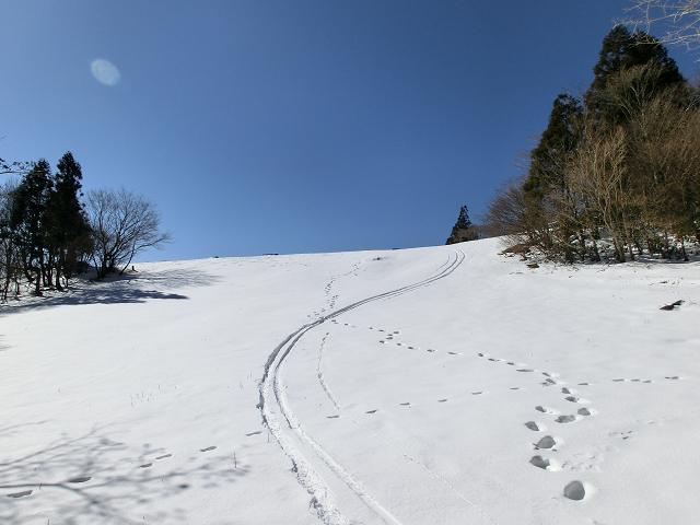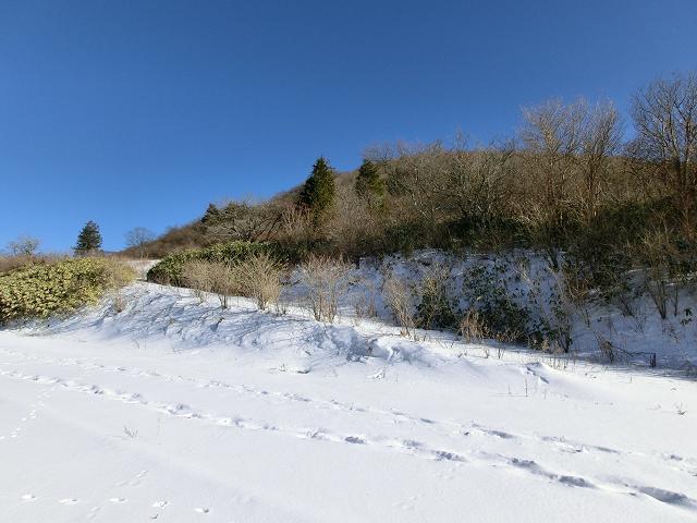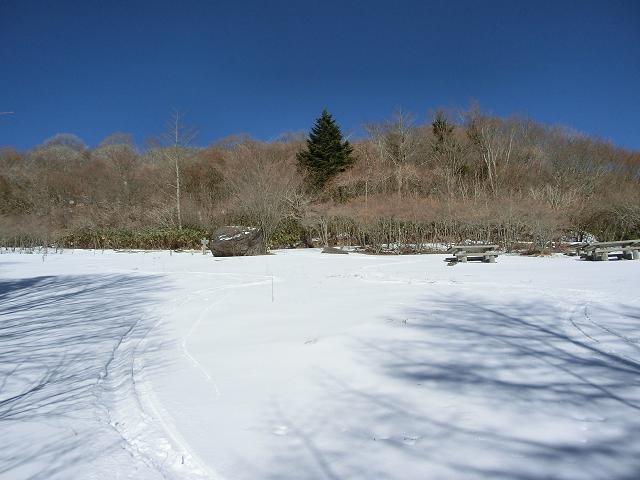 気持ち良く陽光が当たり、風も抜ける緩斜面なので、下部に生える樹木の周囲以外は、土の上に数cmの固めの層があり、その上に1cm程昨夜降ったであろう雪が乗っている状態でした。