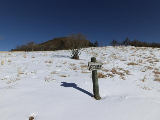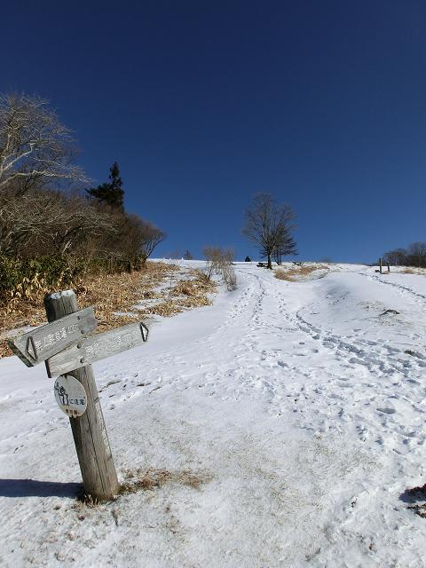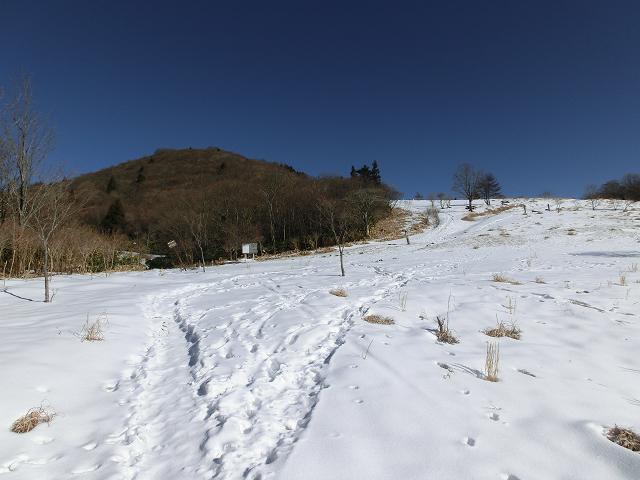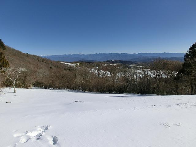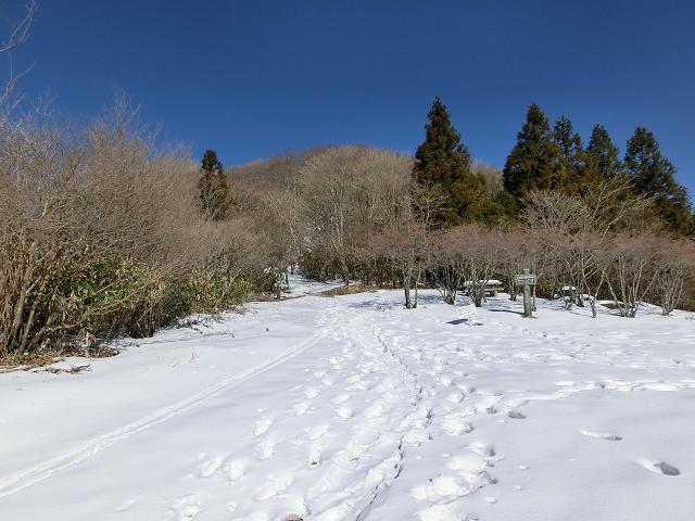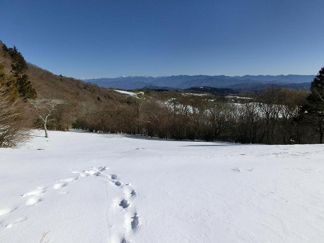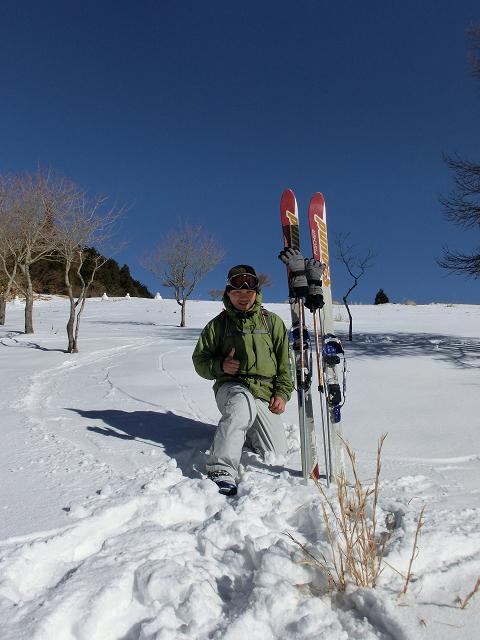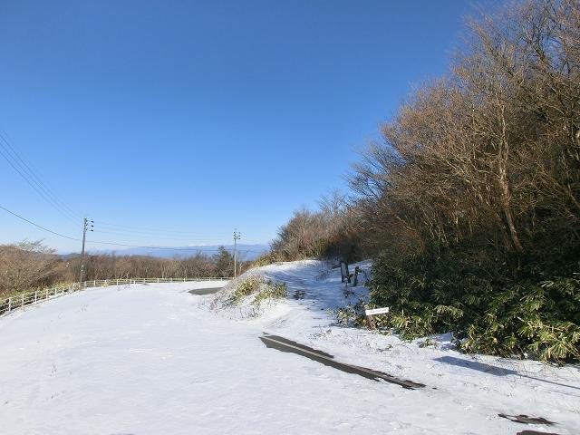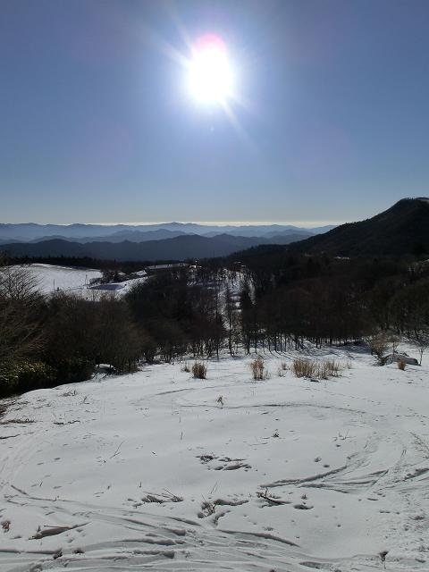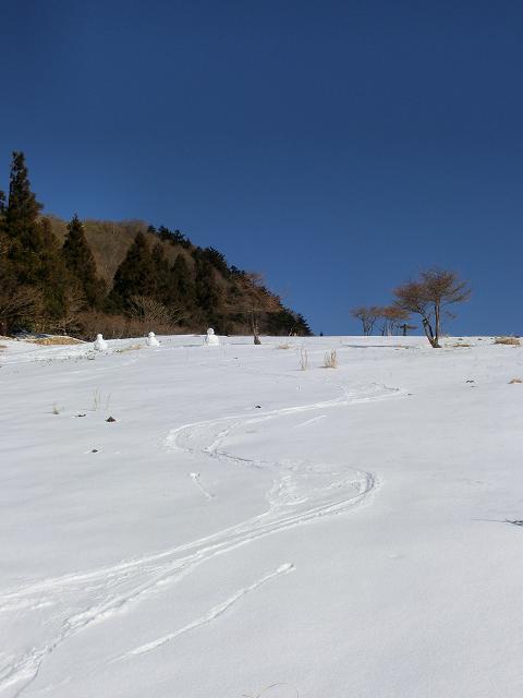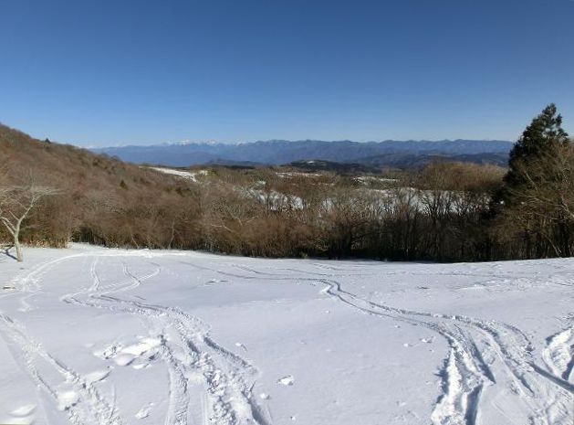 気持ち良く陽光が当たり、風も抜ける緩斜面なので、下部に生える樹木の周囲以外は、土の上に数cmの固めの層があり、その上に1cm程昨夜降ったであろう雪が乗っている状態でした。