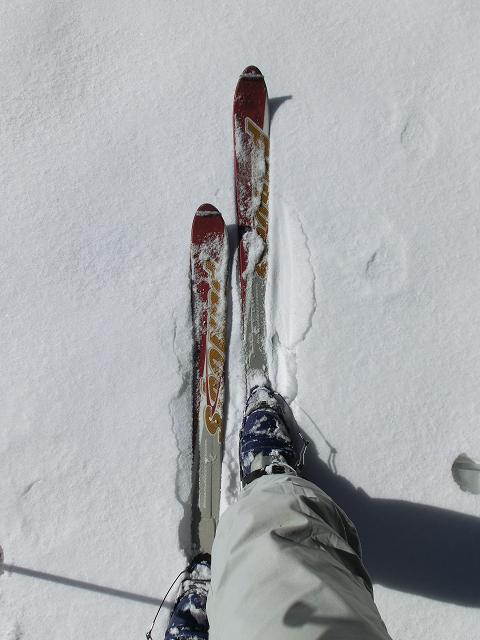 踏んでしまえば潜って制御困難に陥ってしまいそうなので、ソロリソロリと踏み変えて、板を振れば引っかかるので、どの辺りまで大丈夫なのか探りつつ、下へ下へと・・・