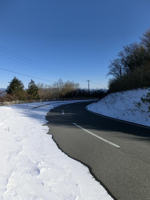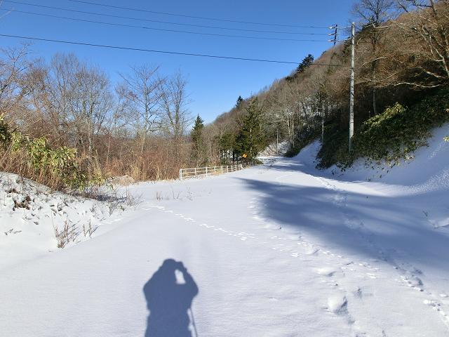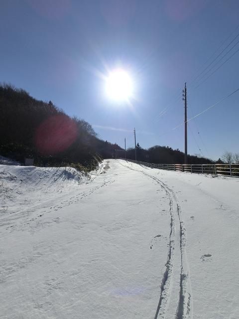 車道は緩斜面のため、積雪量が多い箇所はスキーが進みませんが、露出したアスファルトの際は氷化しているので滑りやすく、際々を狙ってシャ~と下りてくることが出来ました。