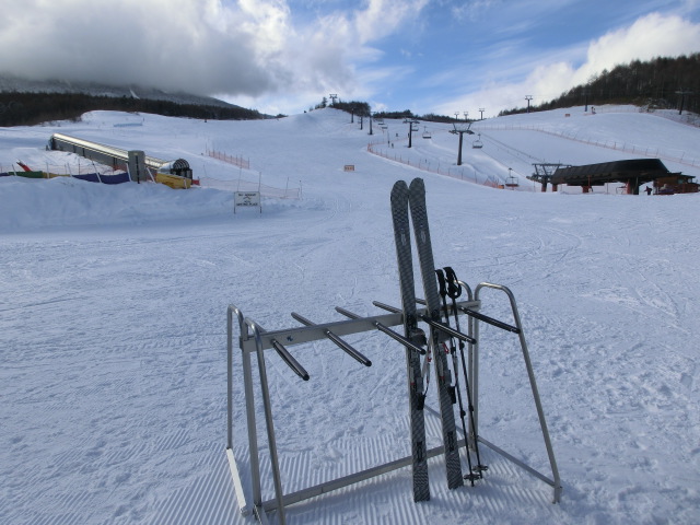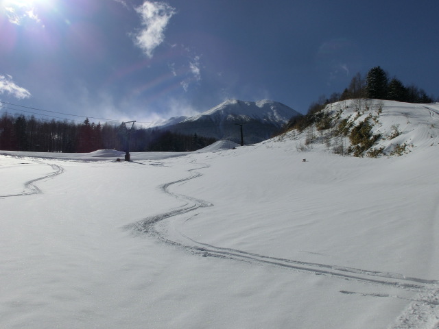 ゲレンデに着いてみると、昨夜の内に5~10cm程度の降雪があった様で、とても滑りやすいバーンとなっており、ゲレンデの端には少しだけ踝パウダーが残されており、柔らかい感触を楽しむことが出来ました。(^^♪