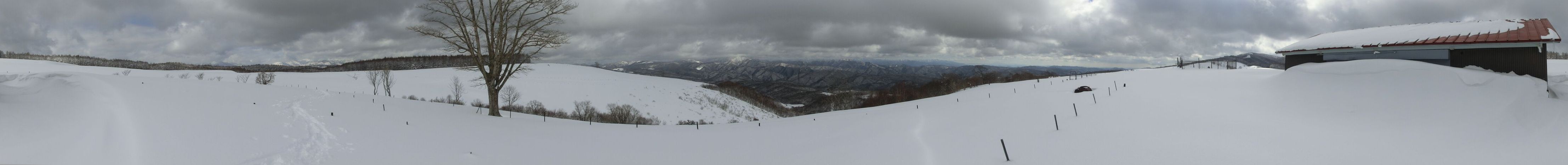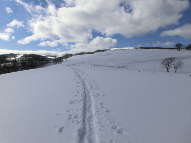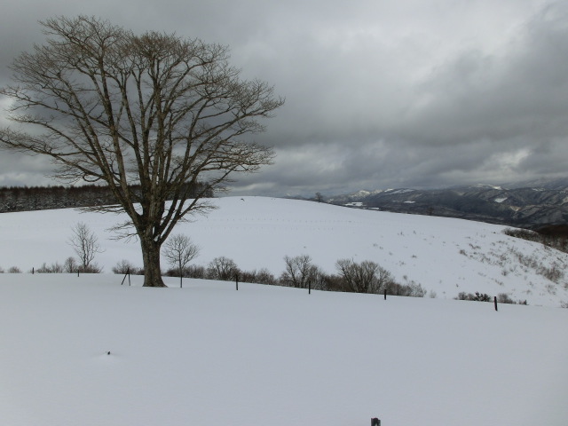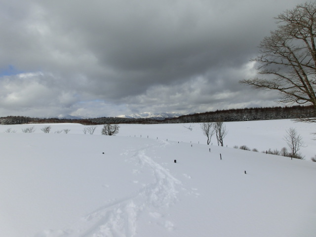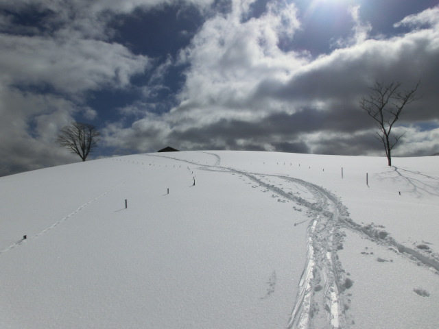牧場までの林道にはモフモフの柔らかい雪が積もっており(右から2番目写)、これは帰りの滑りが楽しみだと思いつつラッセルしていました。