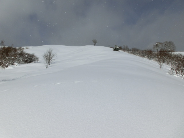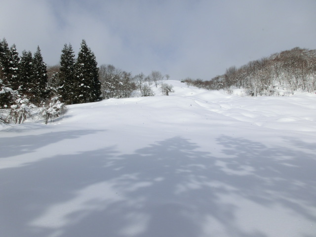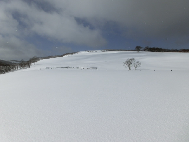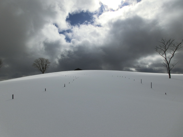 しかし、牧場に入ると重い湿り雪と変化し(右写)、板やストックに着雪しラッセルが辛く感じだし、これは帰りの滑りも大変そうだ・・・と思う様になりました。