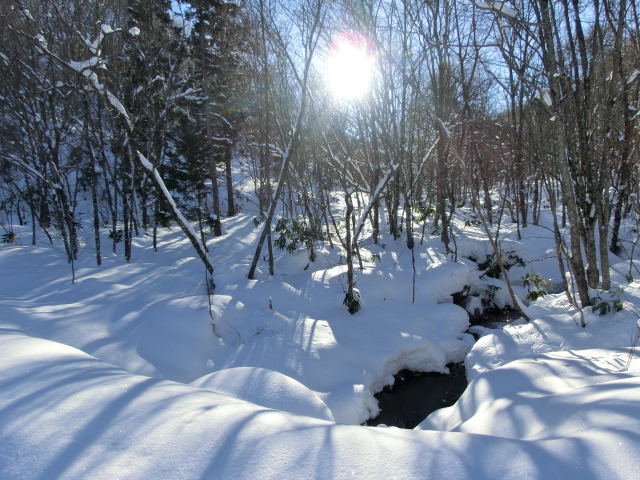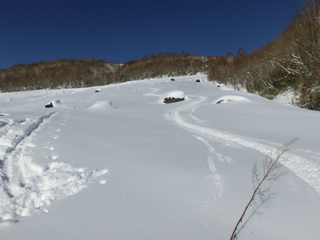 そこから下りてみると小川を渡る橋があり、その先には本日最初に滑走した斜面がありました。