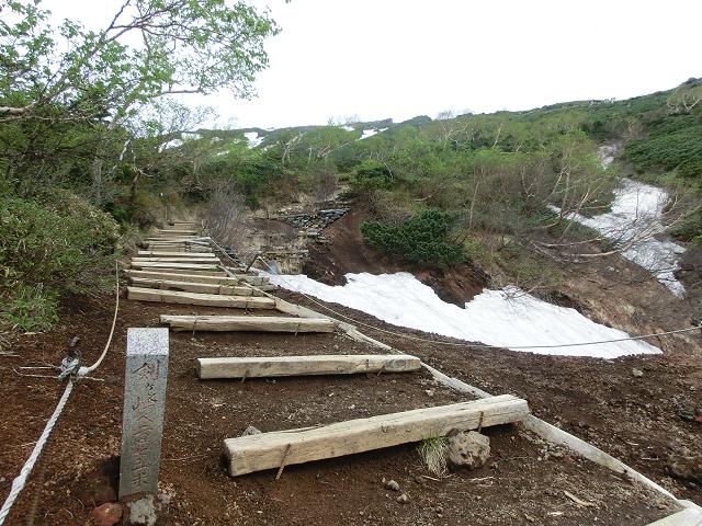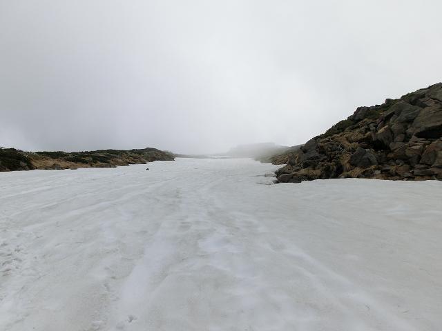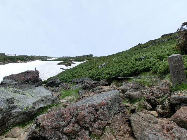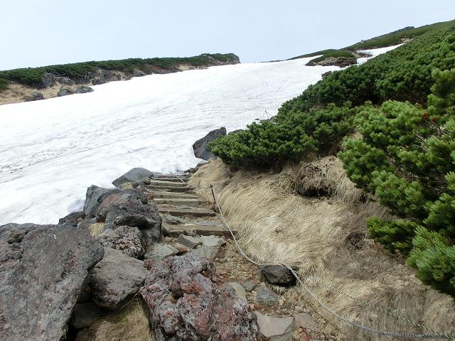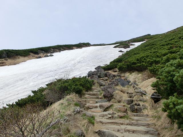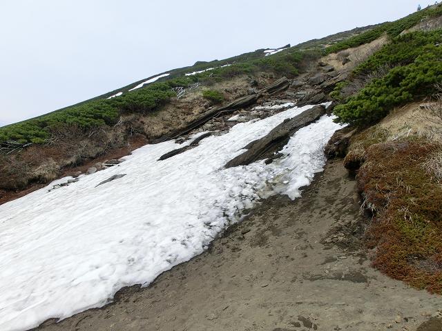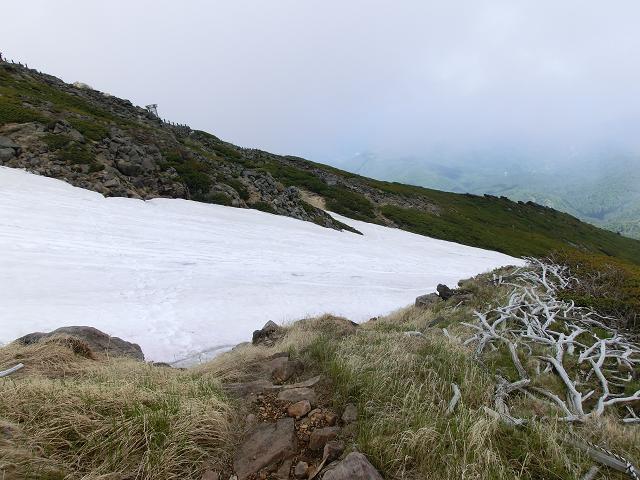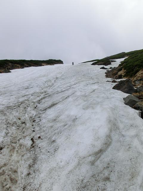 雪渓のくぼ地の右側を上がると、一度登山道に入り、再度少しだけ雪渓を横断し、再び登山道に入ります。