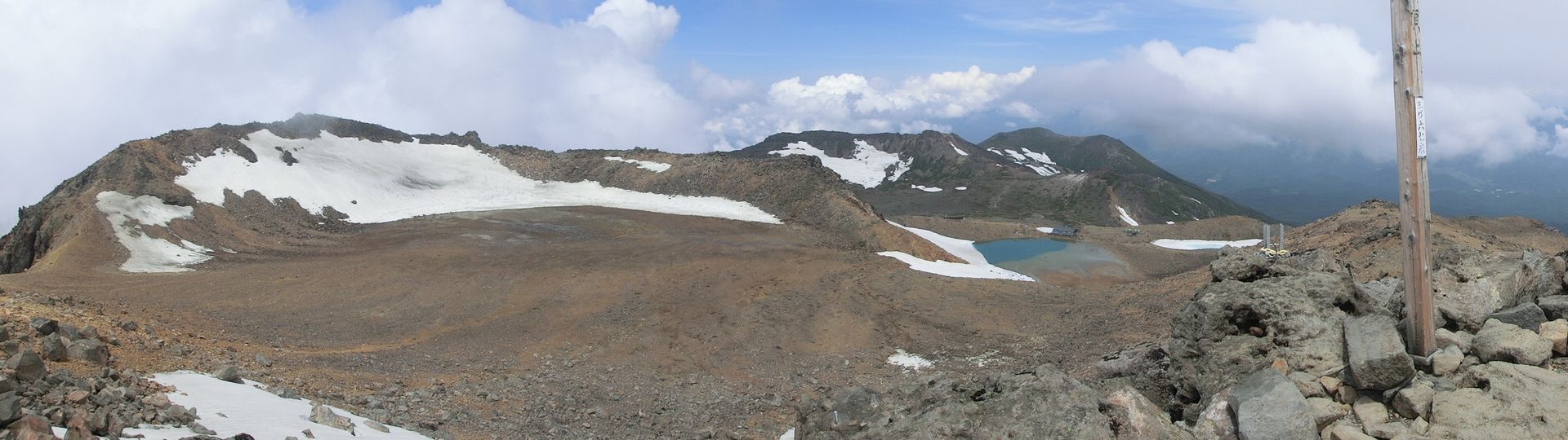 登山道には沢山のイワカガミが咲き、剣ヶ峰からは継子岳まで見渡すことができ、眼下に見えた二の池のエメラルドグリーンがとても印象的でした。
