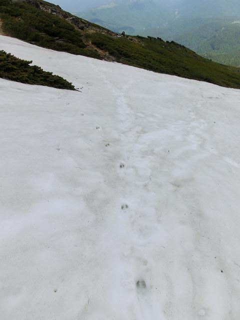 とりあえず、カモシカの足跡を辿って雪渓を横断し、奥の院との分岐へ向かいました。