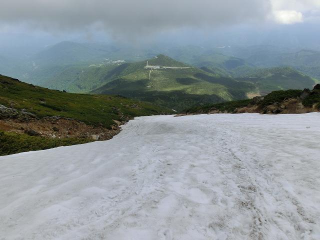 奥の院との分岐から少し登山道を下り、往路で横断した雪渓に進みました。