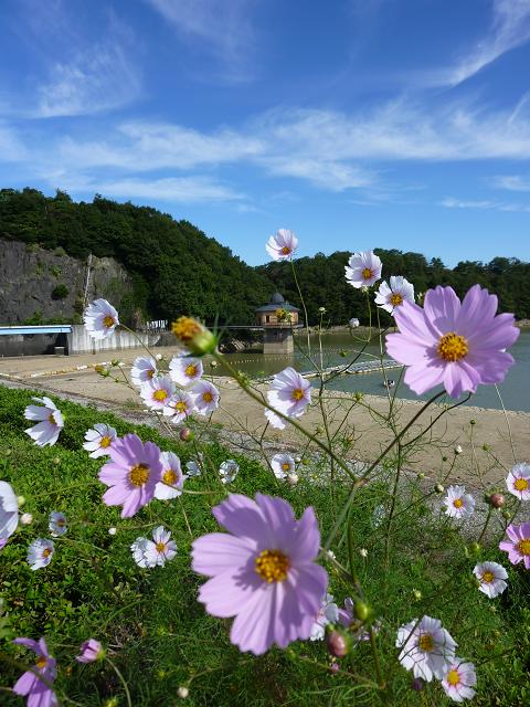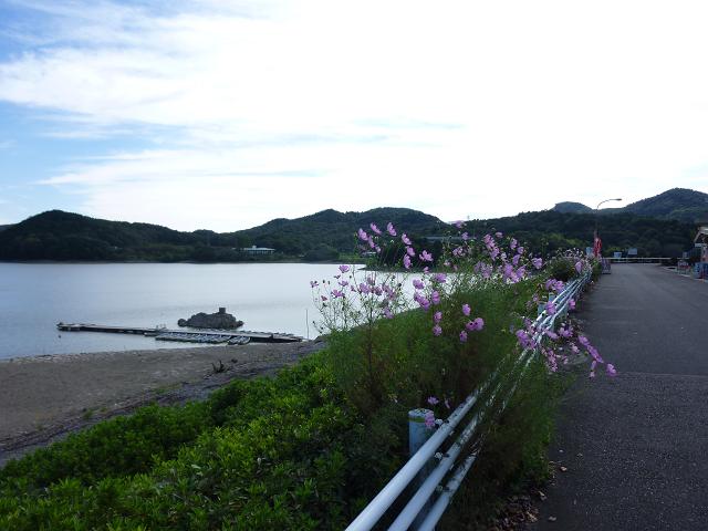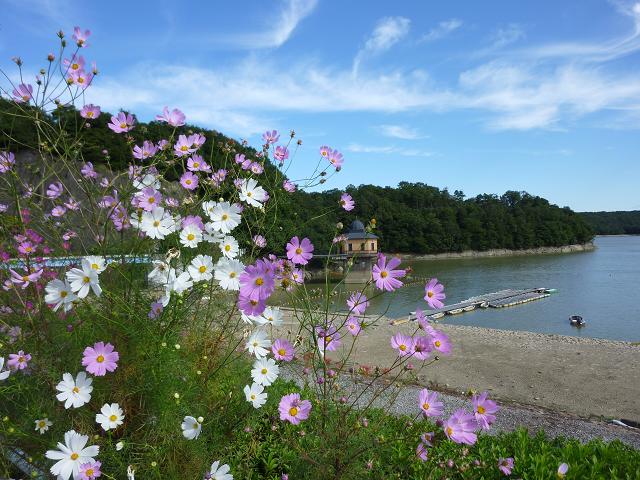 コスモスが秋風に揺れながら、湖畔を華やかにしていました。