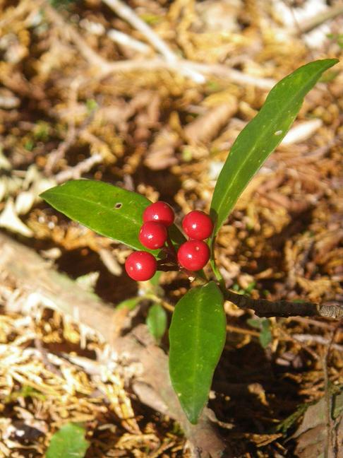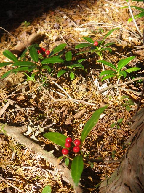日の光が射す場所に、赤い実を付けたツルシキミ(有毒)が育っていました。