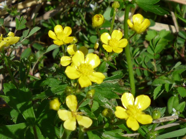 キンポウゲが春の陽光に照らされてトレイル脇を縁取ります。