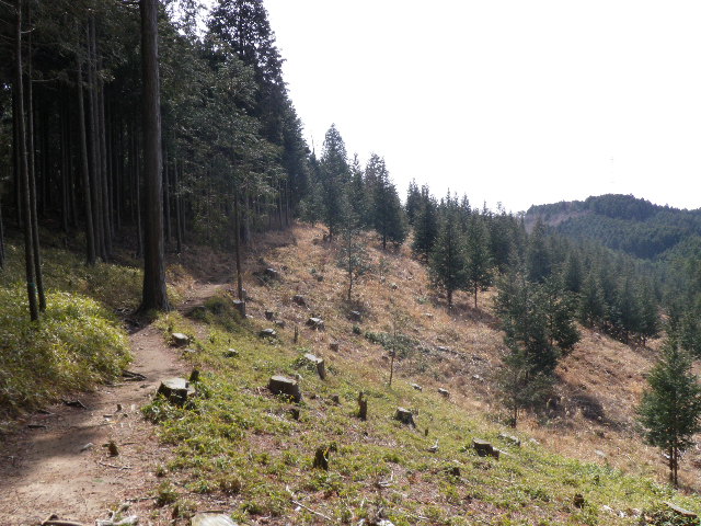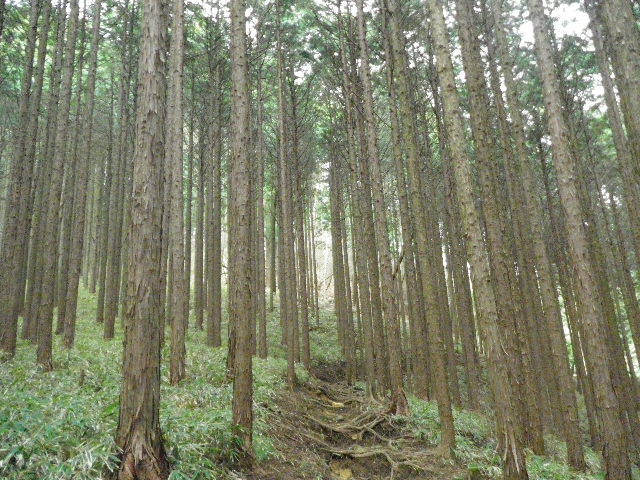 下草が笹の快適な林の中を抜けた後、この様なトレイルを進み1度車道へ出ます。
