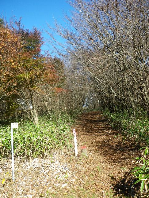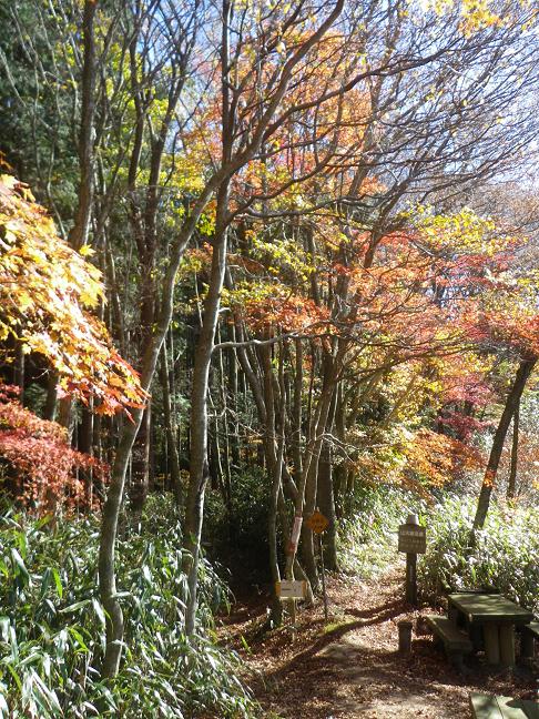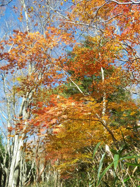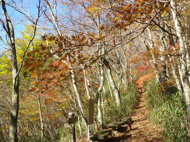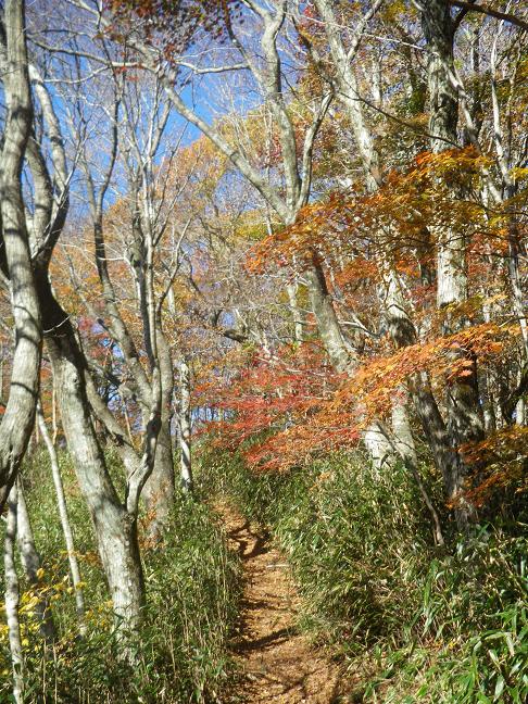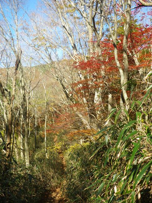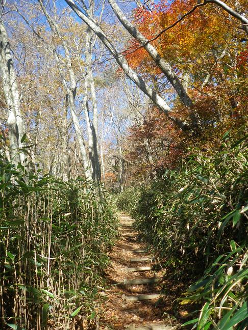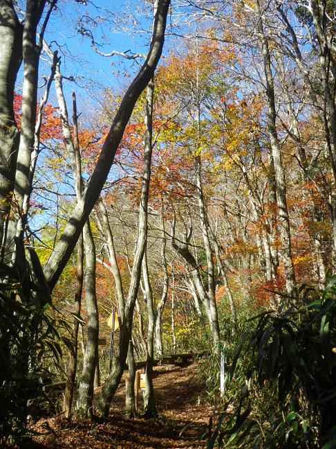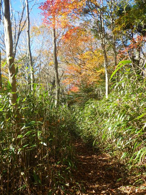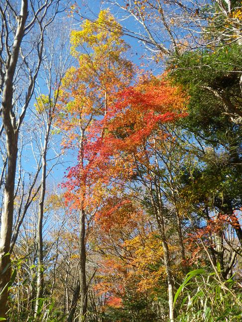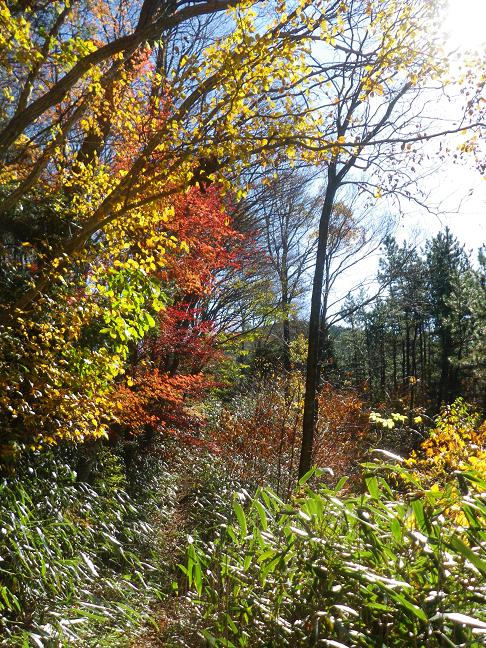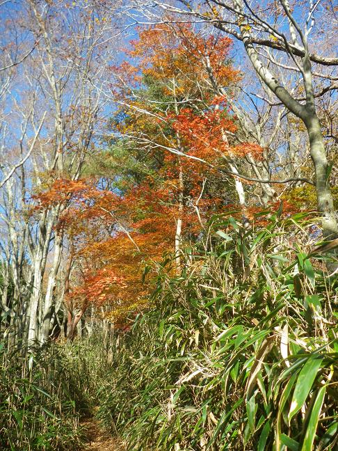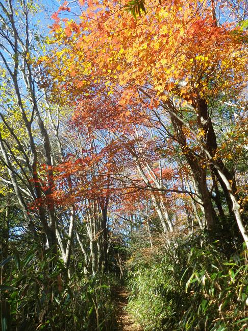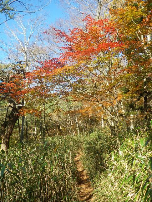 富士見峠へ続く尾根に近づくと、植林地帯を抜け、明るく開け、そこには美しい紅葉が待っていました。