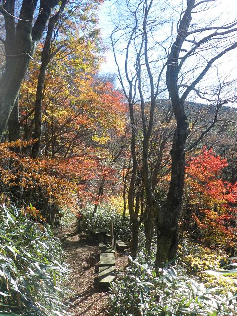植林地帯を抜け、明るい富士見峠へ続く尾根に出ると、そこには素晴らしい紅葉が待っていました。(中写)