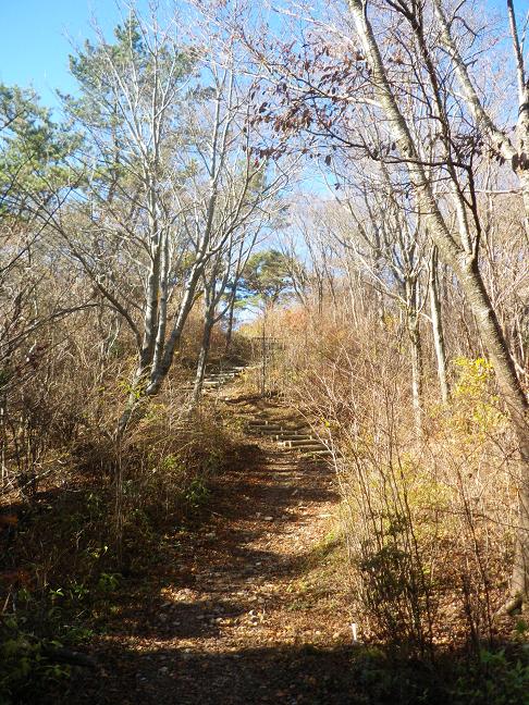 富士見峠までほぼ一直線に、この様なトレイル(木階段)を上がっていきます。