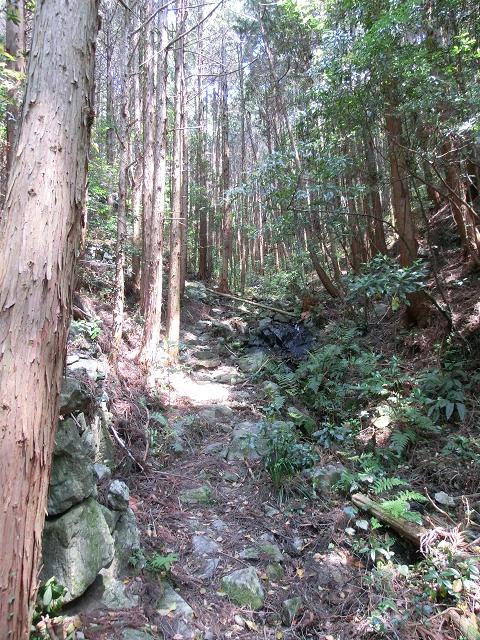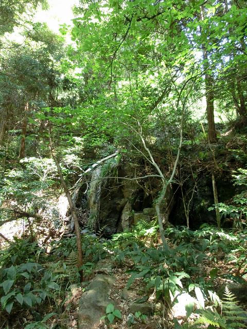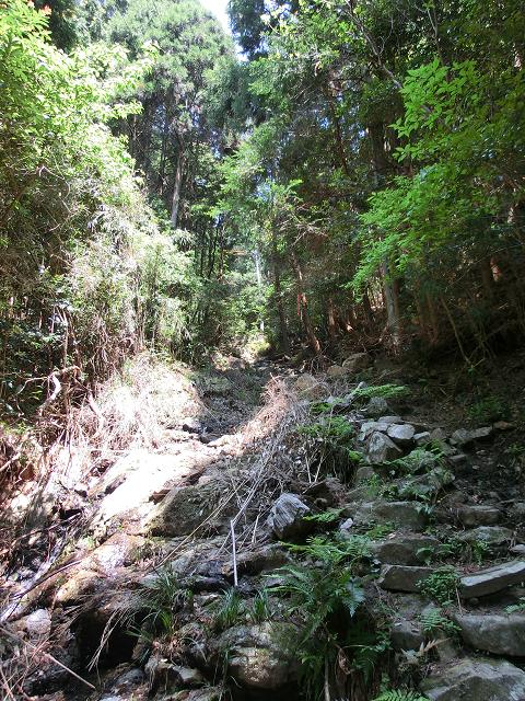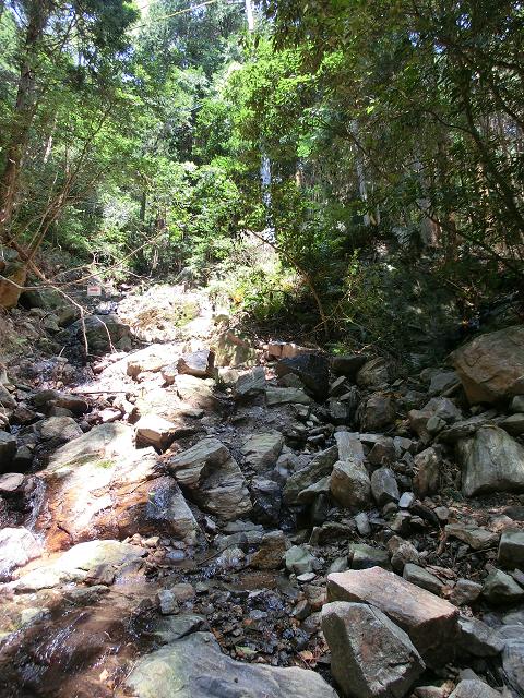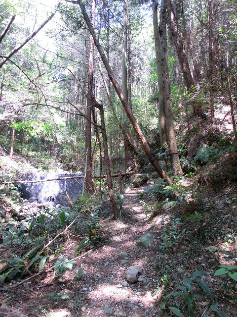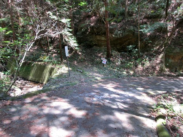 岩から流れ落ちる小沢を右へ上がれば、林道に出合います。