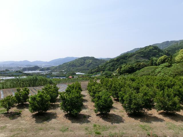 すると、左手のみかん畑の先にとよおか湖公園のスベリ台が見えます。(下段左写)