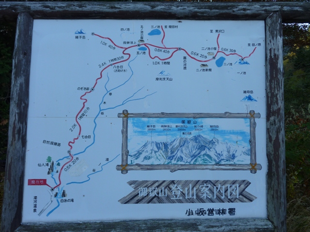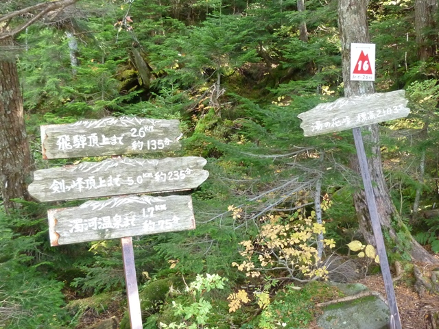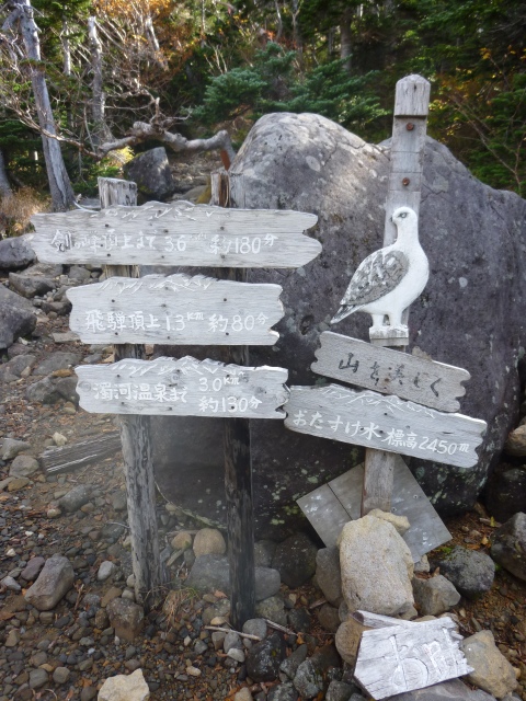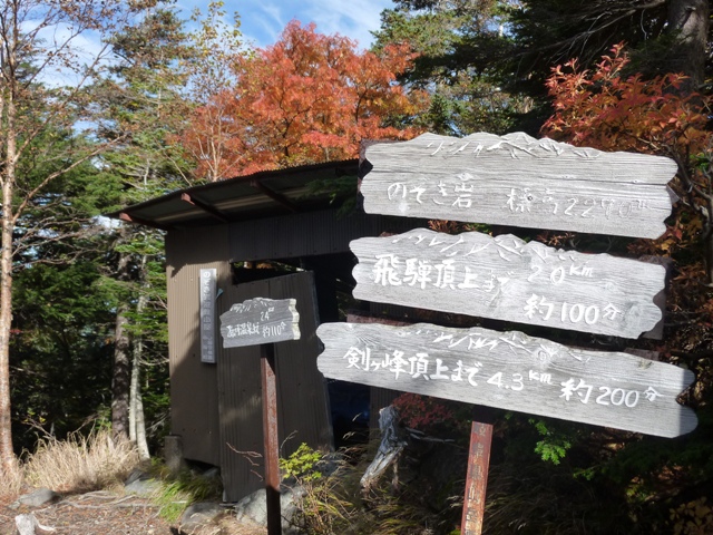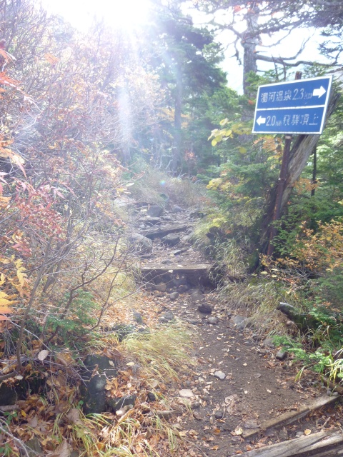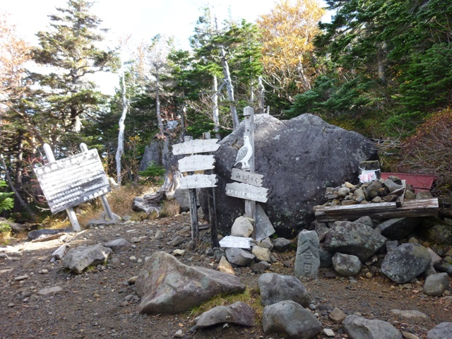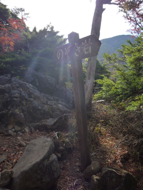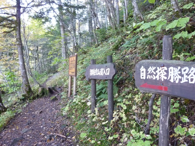 登山道半ばに案内板(左写)があり、キャンプ場への分岐(右写)があります。