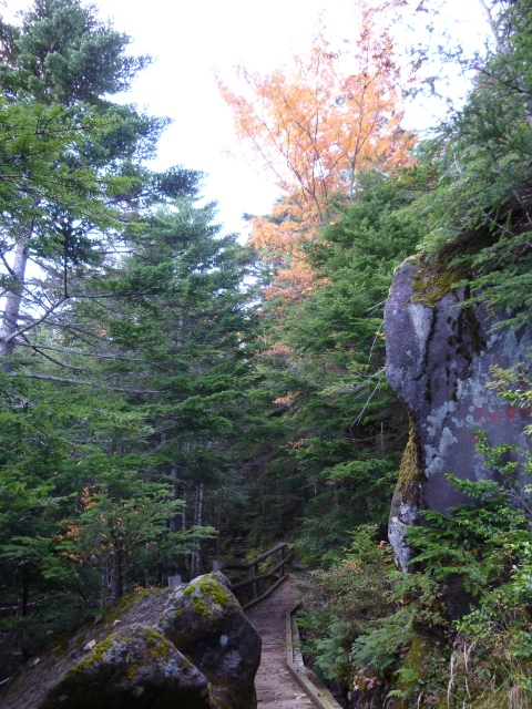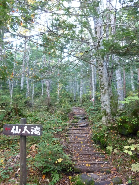 トレイル入口(左写)を少し進むと、仙人滝への分岐(中写)がありますが、寄り道せずに直進すると少し仙人滝(右写)が見えました。
