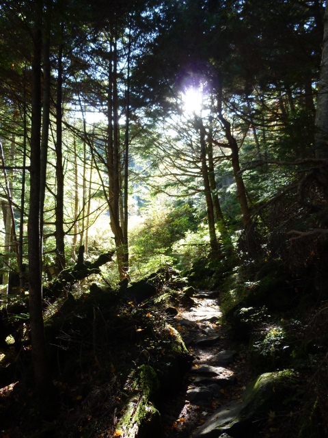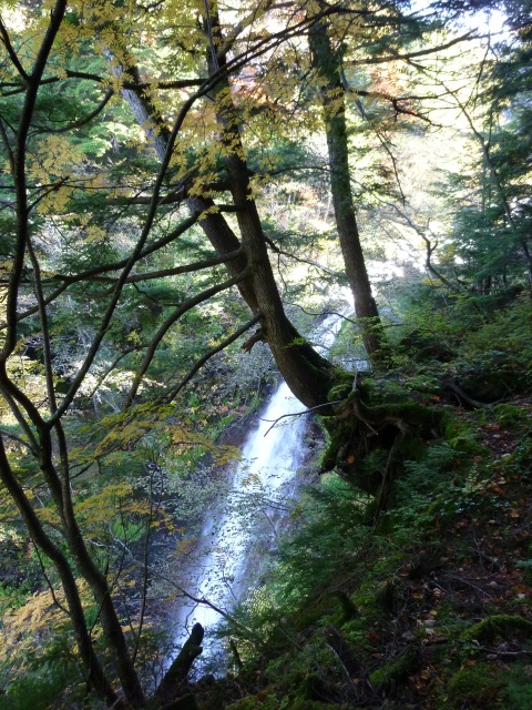滝の音を聞きながら、朝日のトレイルを進みます。(左写)