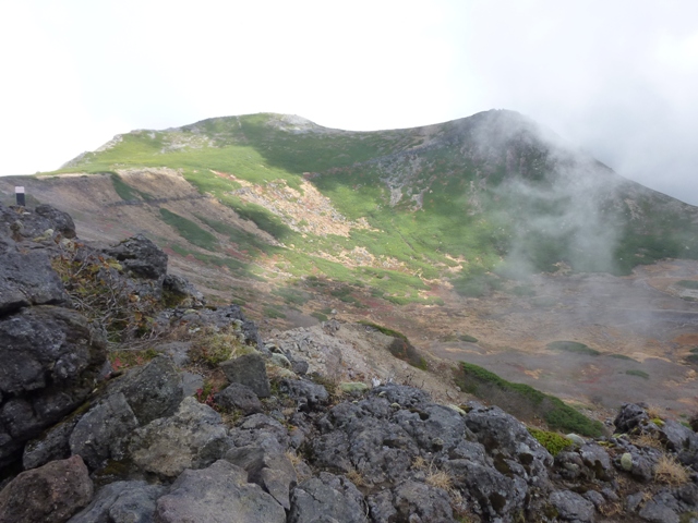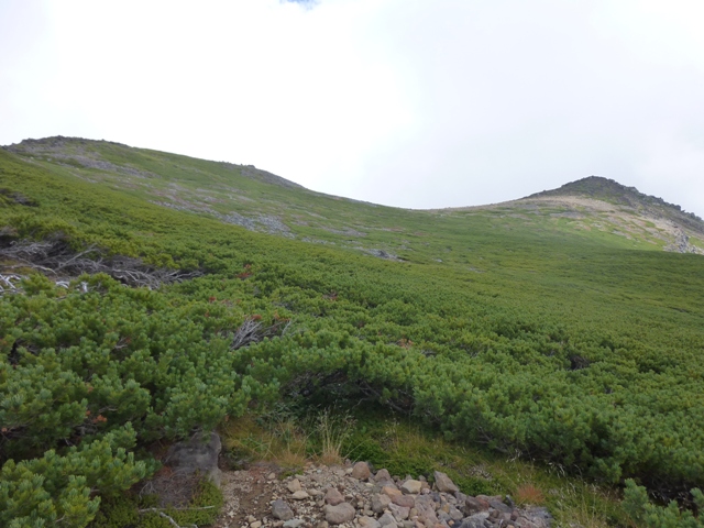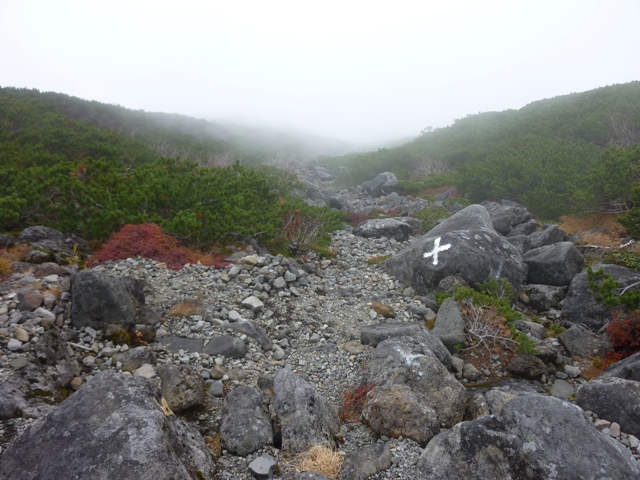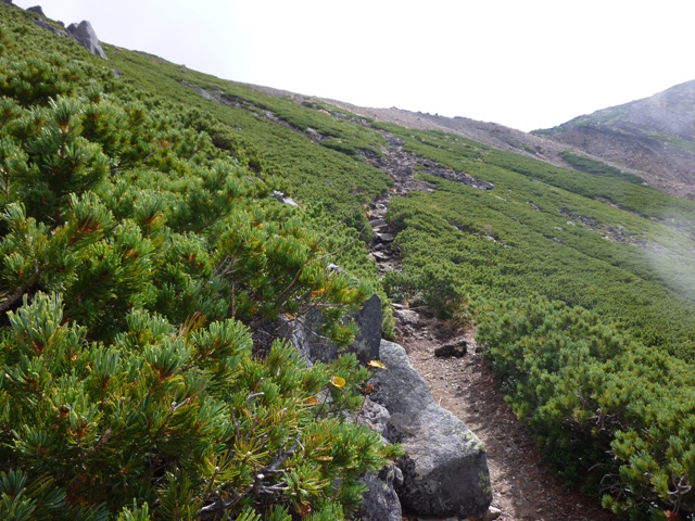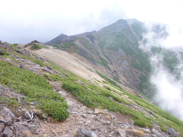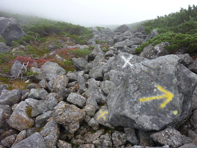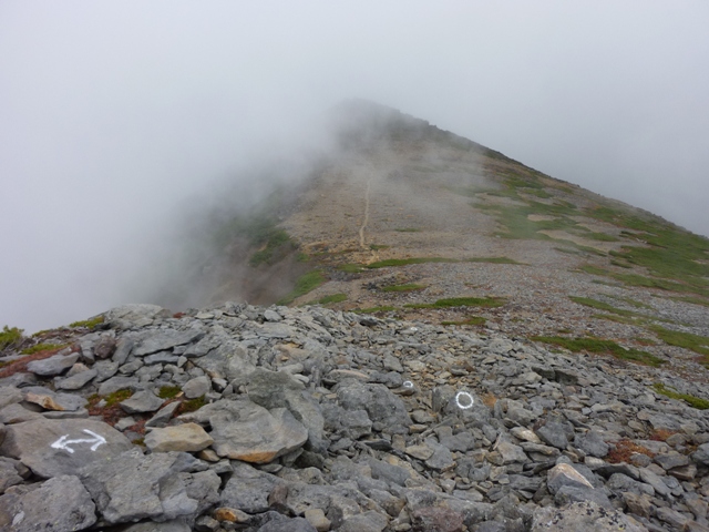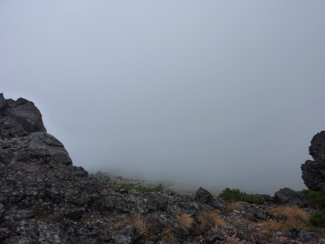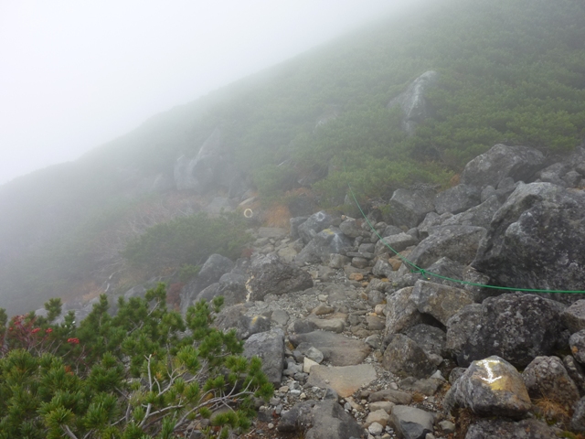 ガスの中で確かではないのですが、おじさんははい松地帯で登山道を外れて下りていかれた様でした。