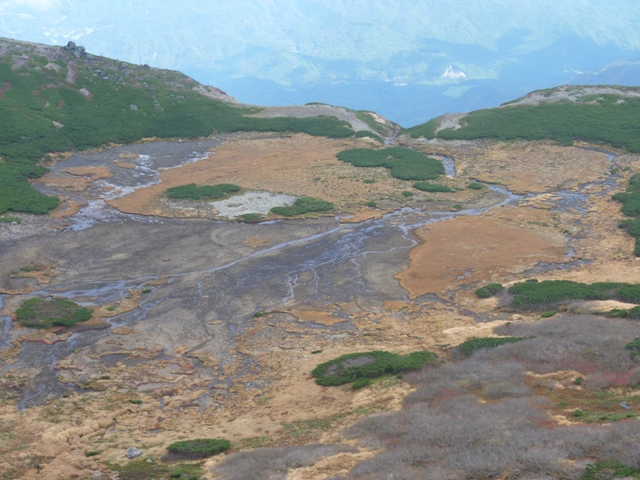 高層湿原になっていて、川の様なスジが見えます。(中写)