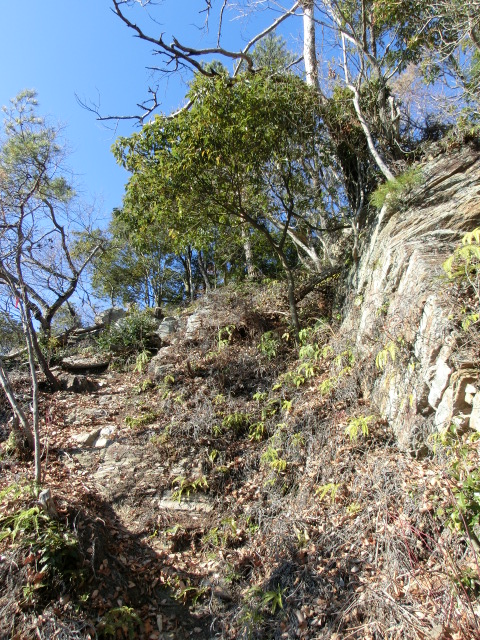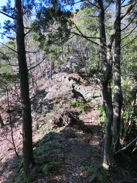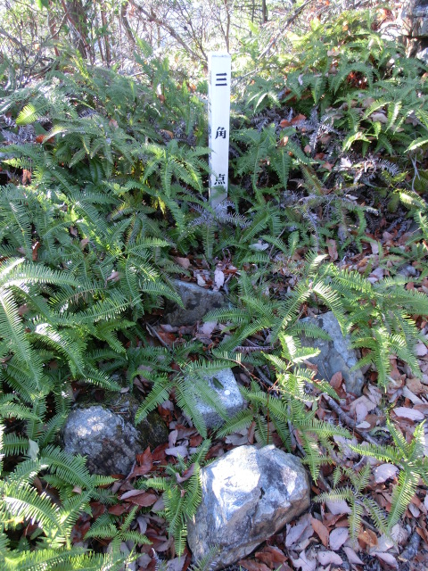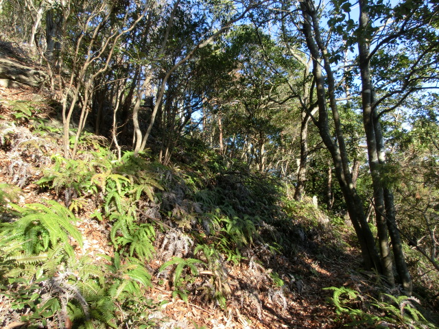 石像が二体並ぶ場所(左写)で右に進み、倒木を越え進むと、左手にシダが生える小山(右写)があり、小山頂へ続く踏み跡が分岐していたので、左折し上がってみると、そこが新嶽山頂でした。