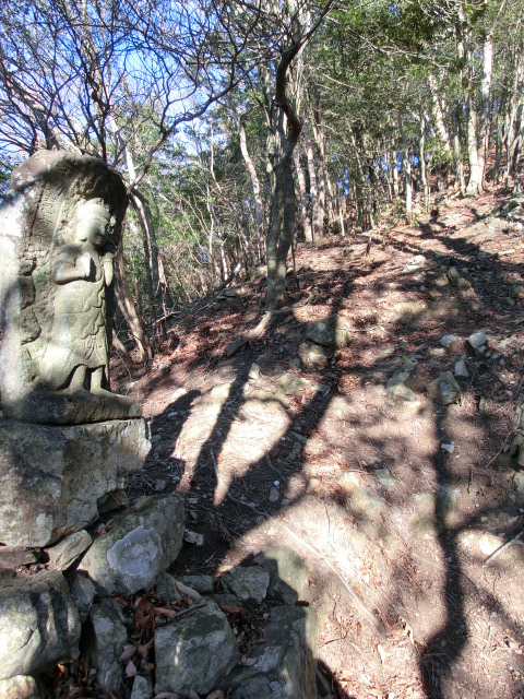 鬼沢八幡社からおおだ山頂へ続く林道の途中にトレイルに入る分岐があるのですが、そこからトレイルに進むと石像と道標がある分岐に出合います。