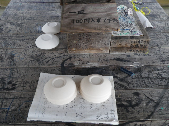 東屋内に机があり、1枚100円の皿が置いてあります。