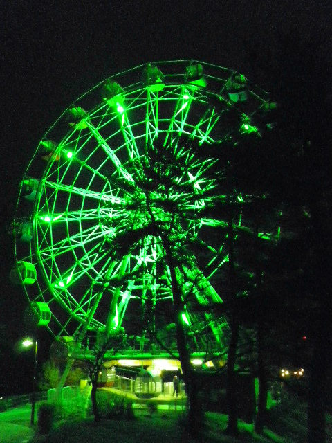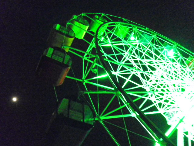 夜桜を見たくて寄り道してみると、観覧車が緑に輝いていました。