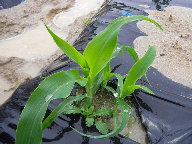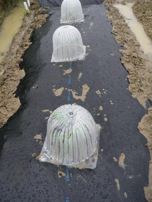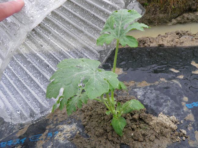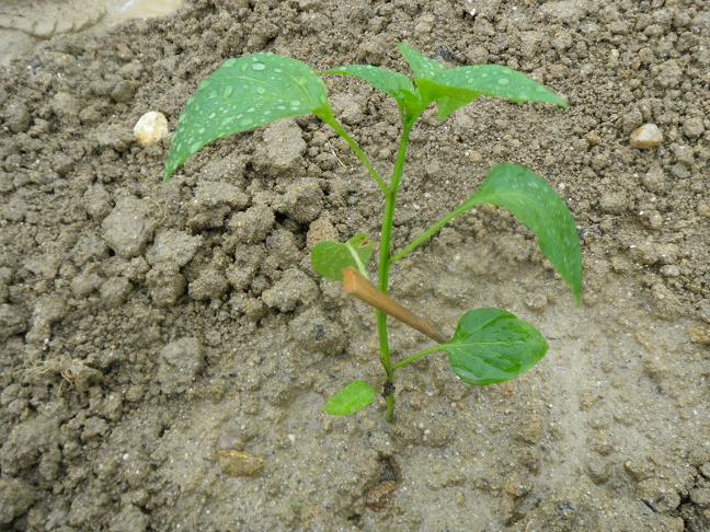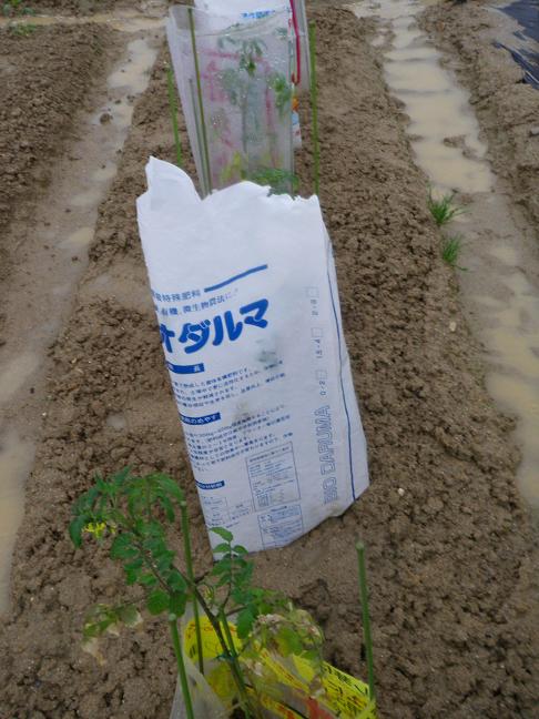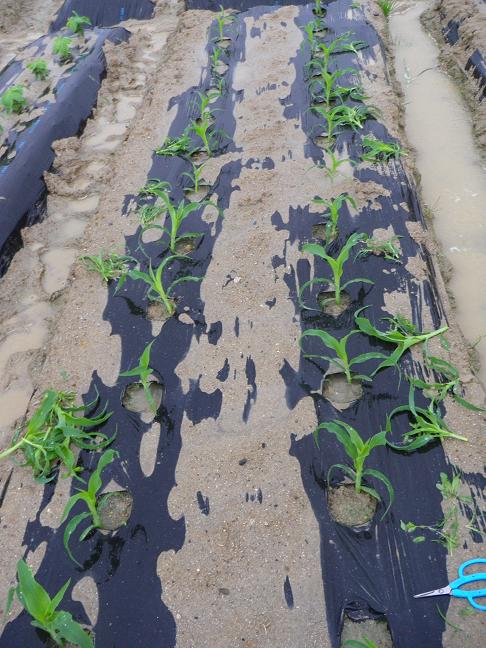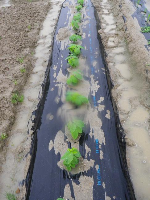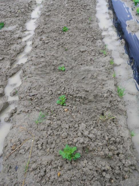 2株だけ生育が良いのですが、実はこちらが普通で、生育が遅い株は種芋の埋入位置を浅く植え替えたためです。(右写)