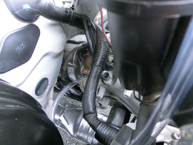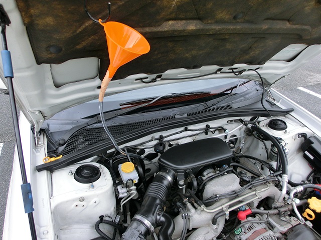 ドレンボルトをケースに装着し、エンジンルーム内のフロントデフオイルレベルゲージが挿入されている穴から、注油しました。