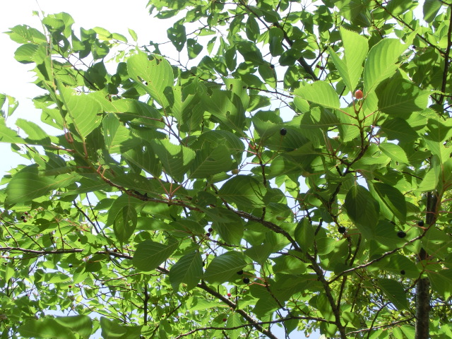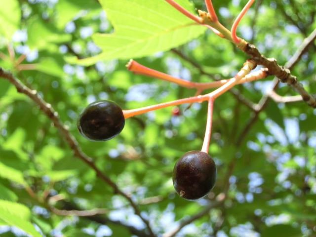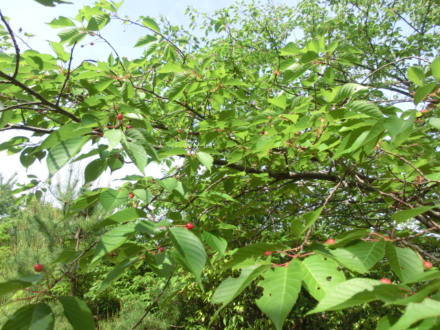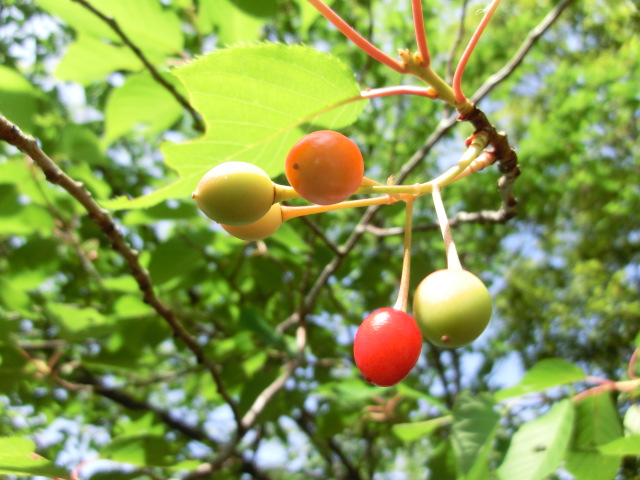 ※桜の実も徐々に熟してきており、実の色が明るい赤色から赤黒く変化してきました。