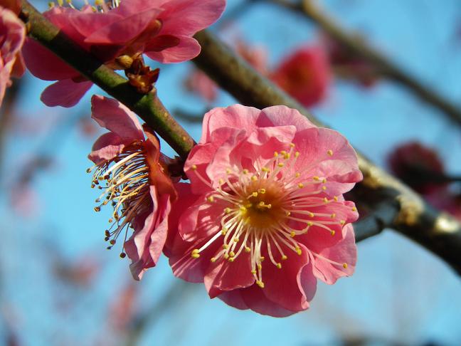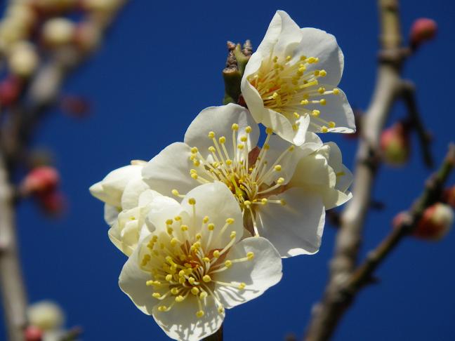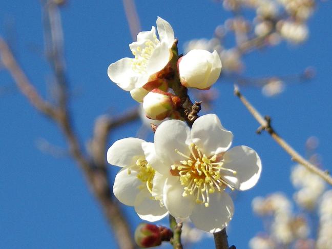 梅の開花を見に近所の公園へ行ってみると、前回は蕾でしたが開花した品種がありました。
