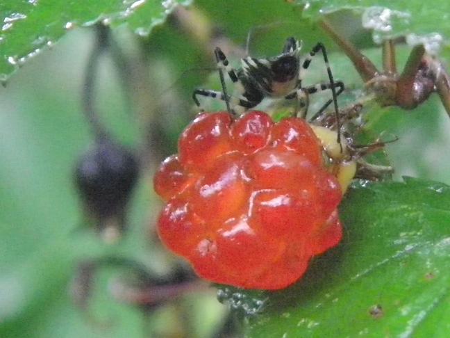 ニガイチゴの葉に隠れて、シマサシガメが雨宿りをしていました。