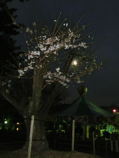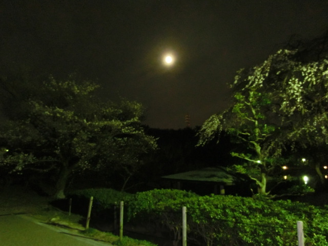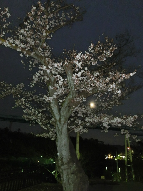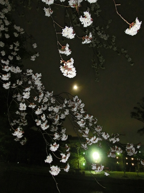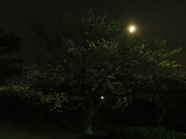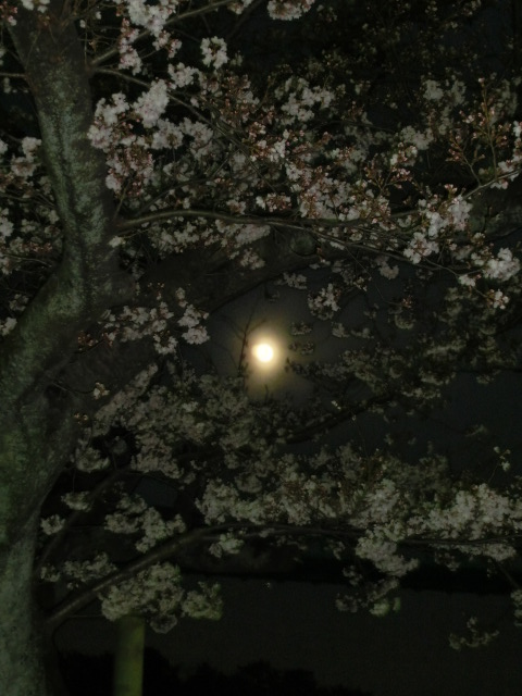 おぼろ月がぼんやりと夜空に浮かび、桜越しに見るととても奇麗でした。