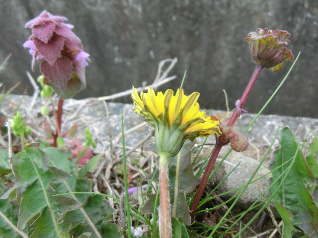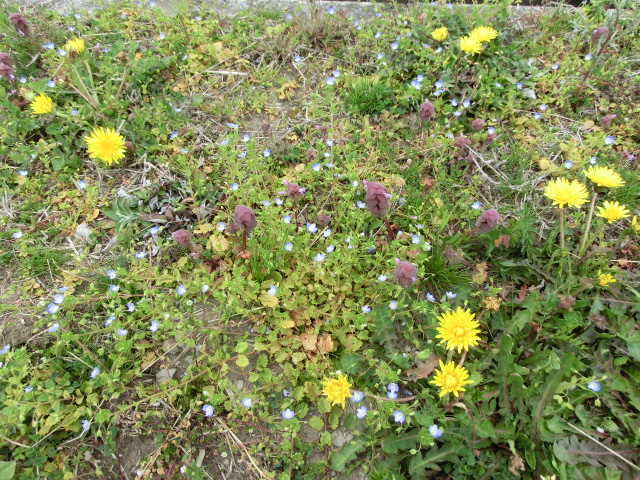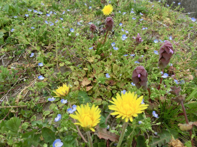 タンポポ(在来種?)とオオイヌノフグリとヒメオドリコソウの組み合わせが、何とも可愛らしかったです。