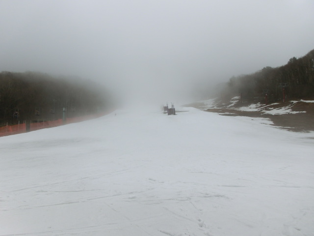 お昼過ぎに到着すると、上部ゲレンデはガスに巻かれており視界不良でした。