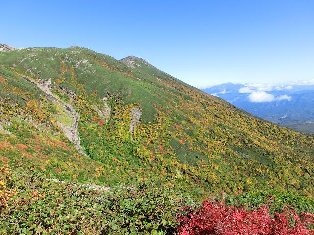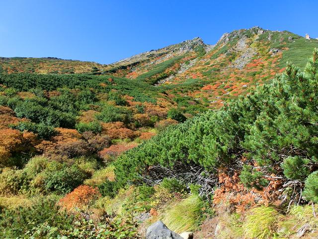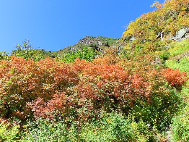 六合目~七合目間では、ゴゼンタチバナの赤い実、シラタマノキの白い実が目を楽しませてくれ、七合目~八合目間から紅(黄)葉が現れ始め、八合目から上はまさに紅(黄)葉の見頃とった様子で、ホシガラスもセッセと捕食に忙しそうでした。