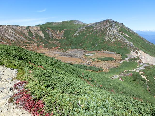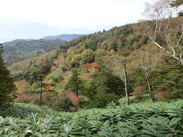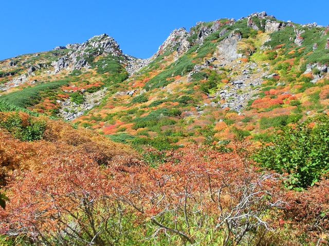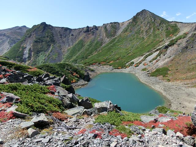 三の池へのトラバースルートからの紅(黄)葉景色は所々まさに錦秋といった様相を呈しており、足元にはゴゼンタチバナ、オオヒョウタンボク、ツリバナ、オオバタケシマラン等の赤い実やシラタマノキの白い実も見かけることができ、三の池周辺では、足元のコケモモの赤い実、ガンコウランの黒い実、クロマメノキの黒い実と紅葉、ミヤマダイコンソウの紅葉等が目を楽しませてくれました。