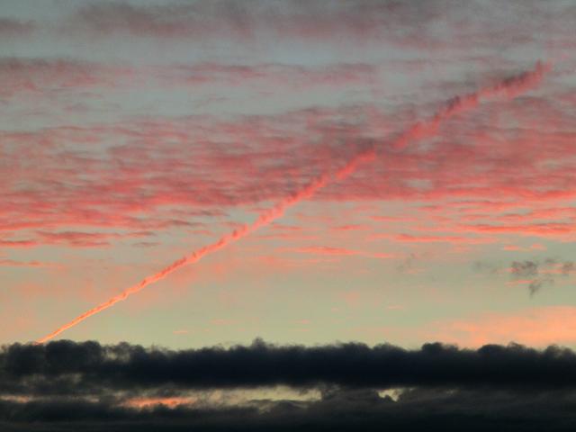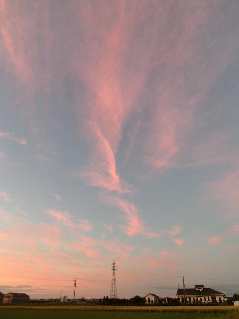 様々な形の雲がピンク色に染まり、綺麗な夕暮れでした。