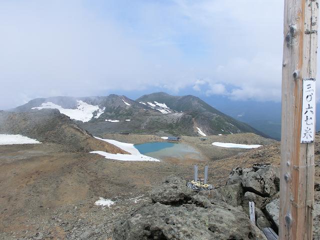 登山道には沢山のイワカガミが咲き、剣ヶ峰からは継子岳まで見渡すことができ、眼下に見えた二の池のエメラルドグリーンがとても印象的でした。
