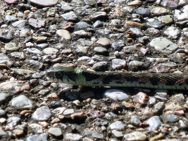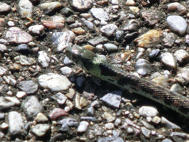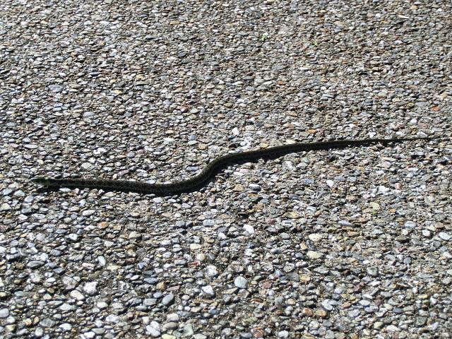 ヤマカガシの幼体が、朝日を気持ちよさげに浴びながら、散歩道を横断して行きました。