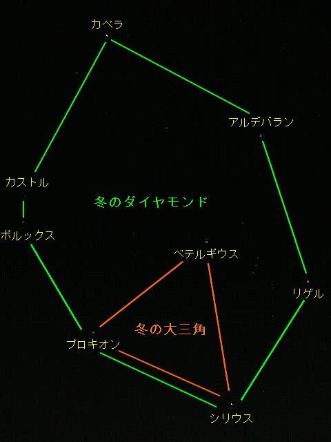 ぎょしゃ座のカペラ、双子座のポルックスとカストル、子犬座のプロキオン、大犬座のシリウス、オリオン座のリゲル、おうし座のアルデバランで、冬のダイヤモンドは構成されます。