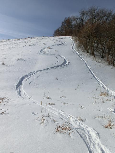 斜面には、一昨日降った雪が10~20cm程乗っており、モッサリ重くなっていましたが、流石に板が太いとパワーが違う様で、何故か私にも快適に滑り下りることが出来ました。(^^)!