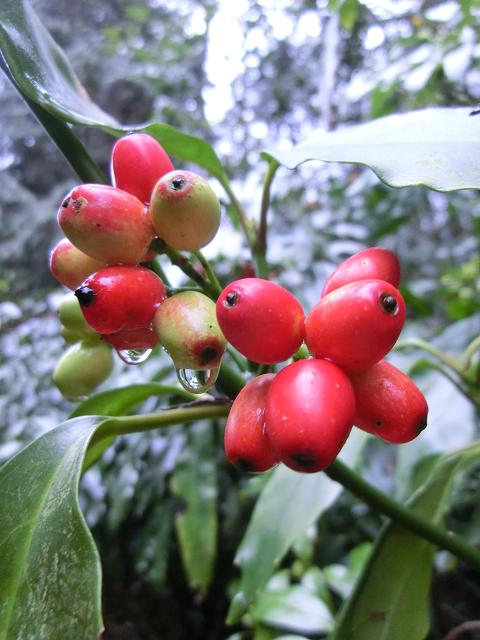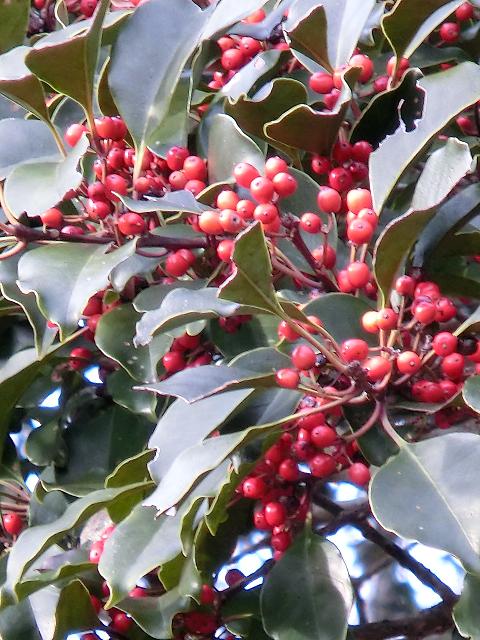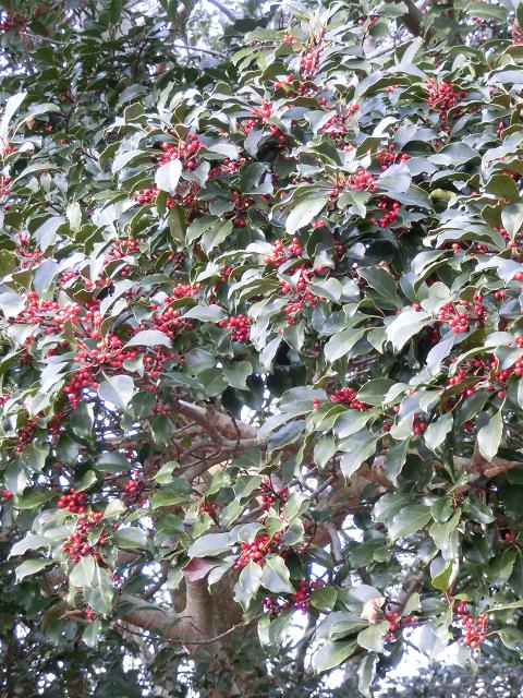 陽光が少ない景色の中で、クロガネモチの赤い実が鮮やかに映えていました。