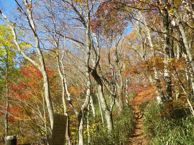 寧比曽岳は三河高原最高なのだそうで、薄暗いクマザサが茂る植林地帯を抜けて富士見峠へと続く尾根に出ると、一気に明るく開けて素晴らしい紅葉を楽しむことが出来ました。